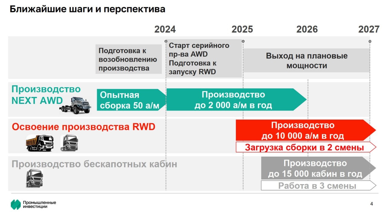 В Калуге же в следующем году планируют начать выпускать новые бескапотные кабины для Уралов, созданных в сотрудничестве с китайским партнером. По 15 000 штук в год. А также выпуск магистральных тягачей по 7 500 штук в год и городских среднетоннажников – по 1 000 штук в год.