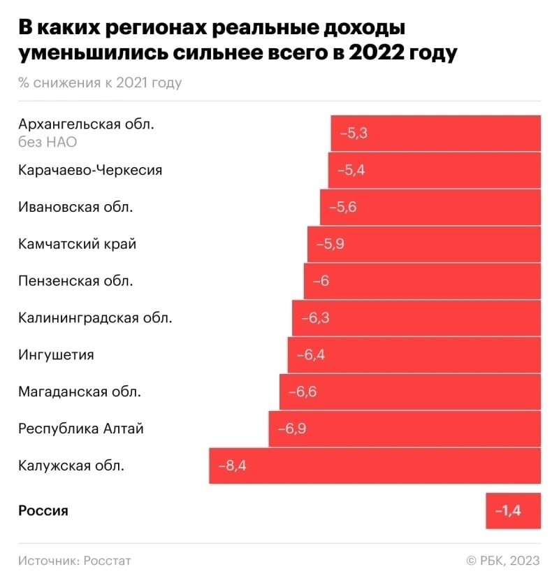 Наибольший прирост реальных доходов по сравнению с предыдущим годом был зафиксирован в Кабардино-Балкарии (+5,6%). Среди лидеров оказалось также несколько добывающих субъектов, а именно Ханты-Мансийский и Чукотский автономные округа (+3,1%), Якутия (+2,3%), Татарстан (+2,1%), Тюменская область (+2%) и Ямало-Ненецкий автономный округ (+1,4%).