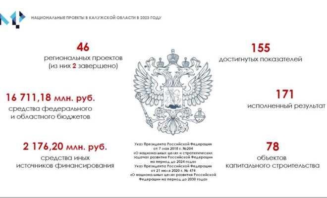 Итоги реализации 46 региональных проектов в рамках 12 нацпроектов в 2023 году были представлены заместителями губернатора региона. На их выполнение было выделено почти 19 млрд рублей. В результате был достигнут 171 результат и 155 показателей. Общий уровень финансового исполнения составил 99,87%. Как сообщает пресс-служба правительства области, Калужская область занимает первое место в Центральном федеральном округе и пятое место в стране по этому показателю, согласно данным Министерства финансов России. Два проекты уже успешно завершены в прошлом году – это “Обеспечение устойчивого сокращения непригодного для проживания жилищного фонда” и “Повышение доступности туристических продуктов”.