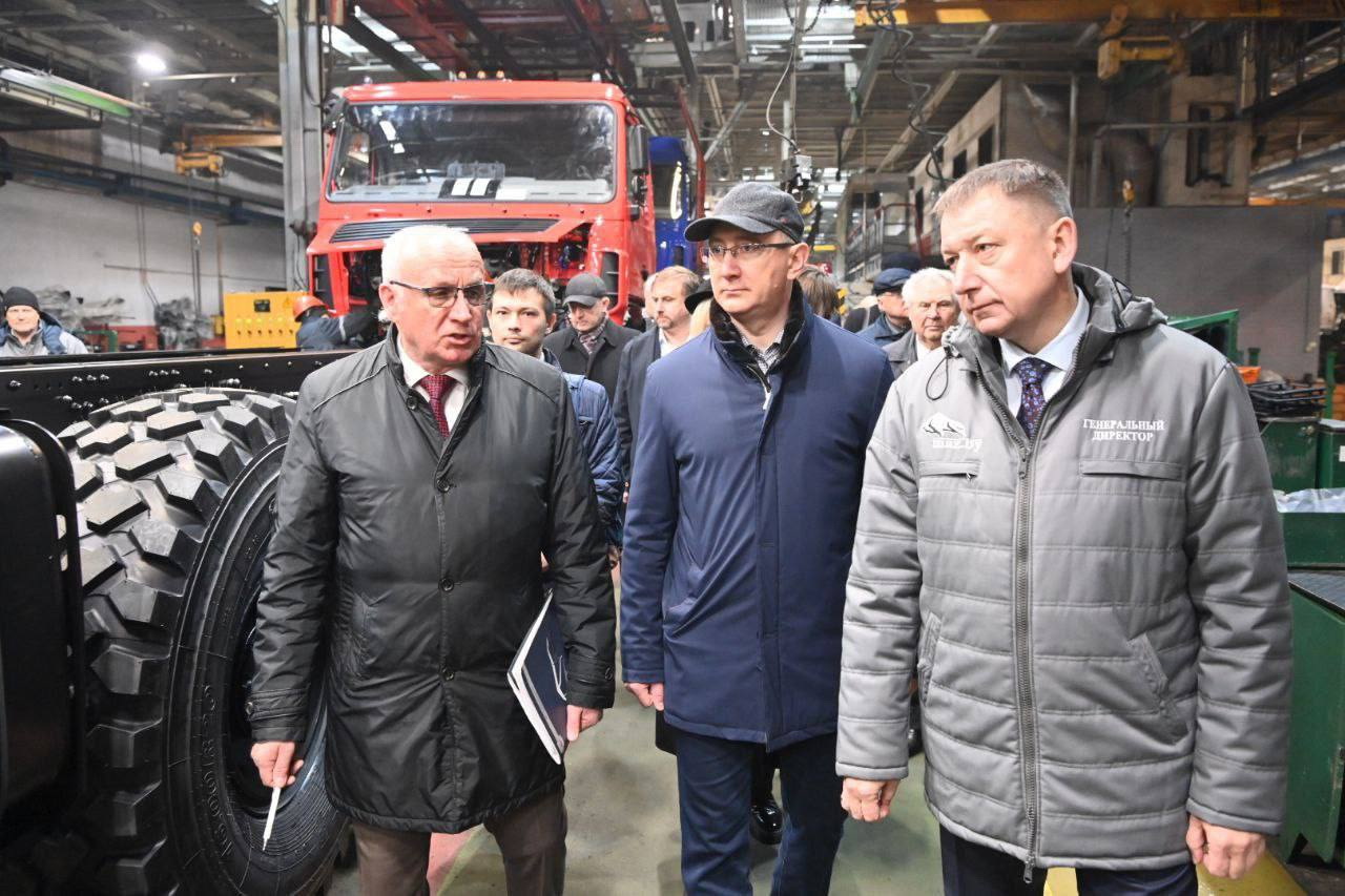 На Минском автомобильном заводе, линейка продукции которого превышает 400 моделей грузовиков, автобусов, троллейбусов и прицепной техники, калужской делегации показали работу конвейера. С 2021 года завод находится под международными санкциями Евросоюза, поэтому теперь в автомобилях используется до 80% комплектующих российского производства.