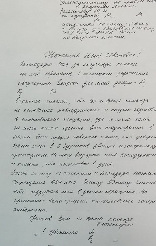 Со словами признательности к Уполномоченному по правам человека в Калужской области Юрию Зельникову и к его консультанту Сергею Гурченкову обратилась осужденная из ФКУ ИК-7 УФСИН России. Правозащитники помогли ее дочери встать на очередь для получения бесплатного жилья.