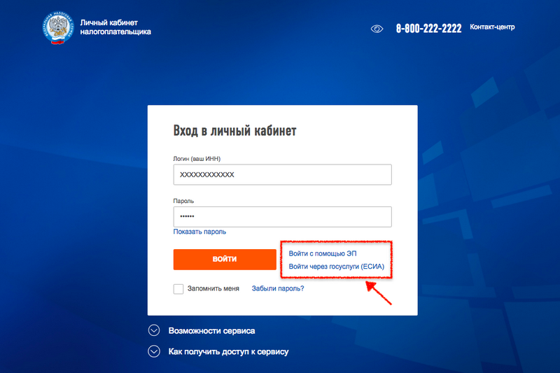 С помощью логина и пароля, указанных в регистрационной карте. Получить регистрационную карту Вы можете лично в любом налоговом органе России, независимо от места постановки на учет. При обращении в налоговый орган России при себе необходимо иметь документ, удостоверяющий личность. Получение доступа к сервису для лиц, не достигших 14 лет, осуществляется законными представителями (родителями, усыновителями, опекунами) при условии предъявления свидетельства о рождении (иного документа, подтверждающего полномочия) и документа, удостоверяющего личность представителя. С помощью квалифицированной электронной подписи. Квалифицированный сертификат ключа проверки электронной подписи должен быть выдан Удостоверяющим центром, аккредитованным Минцифры России и может храниться на любом носителе: жестком диске, USB-ключе или смарт-карте. При этом требуется использование специального программного обеспечения-криптопровайдера: CryptoPro CSP версии 4.0 и выше для работы по ГОСТ 2012 года. С помощью учетной записи Единой системы идентификации и аутентификации (ЕСИА) – реквизитов доступа, используемых для авторизации на Едином портале государственных и муниципальных услуг. Внимание! Авторизация возможна только для пользователей, которые обращались для получения реквизитов доступа лично в одно из мест присутствия операторов ЕСИА (отделения Почты России, МФЦ и др.)Бывают случаи, когда пользователь не может войти в Личный кабинет по причине утери пароля доступа. Восстановить пароль и войти в Личный кабинет можно несколькими способами.