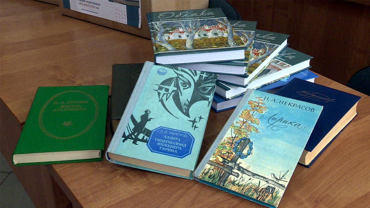 Елена Синякова, директор библиотеки Белинского: "В свою очередь от библиотеки мы тоже собираем книги для Первомайской библиотеки. Вот уже мы представили "Облака", это альманах наших калужских писателей, для знакомства с нашей калужской землей, с нашими писателями в библиотеку мы передадим эти книги".