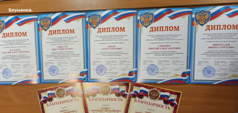 В ноябре 2023 года на базе кафедр РК4 "Подъемно-транспортные системы" МГТУ им. Н.Э. Баумана и МК9 "Подъемно-транспортные системы" был проведен конкурс студенческих научных работ по специальности 23.05.01 "Наземные транспортно-технологические средства". Победителями конкурса стали: