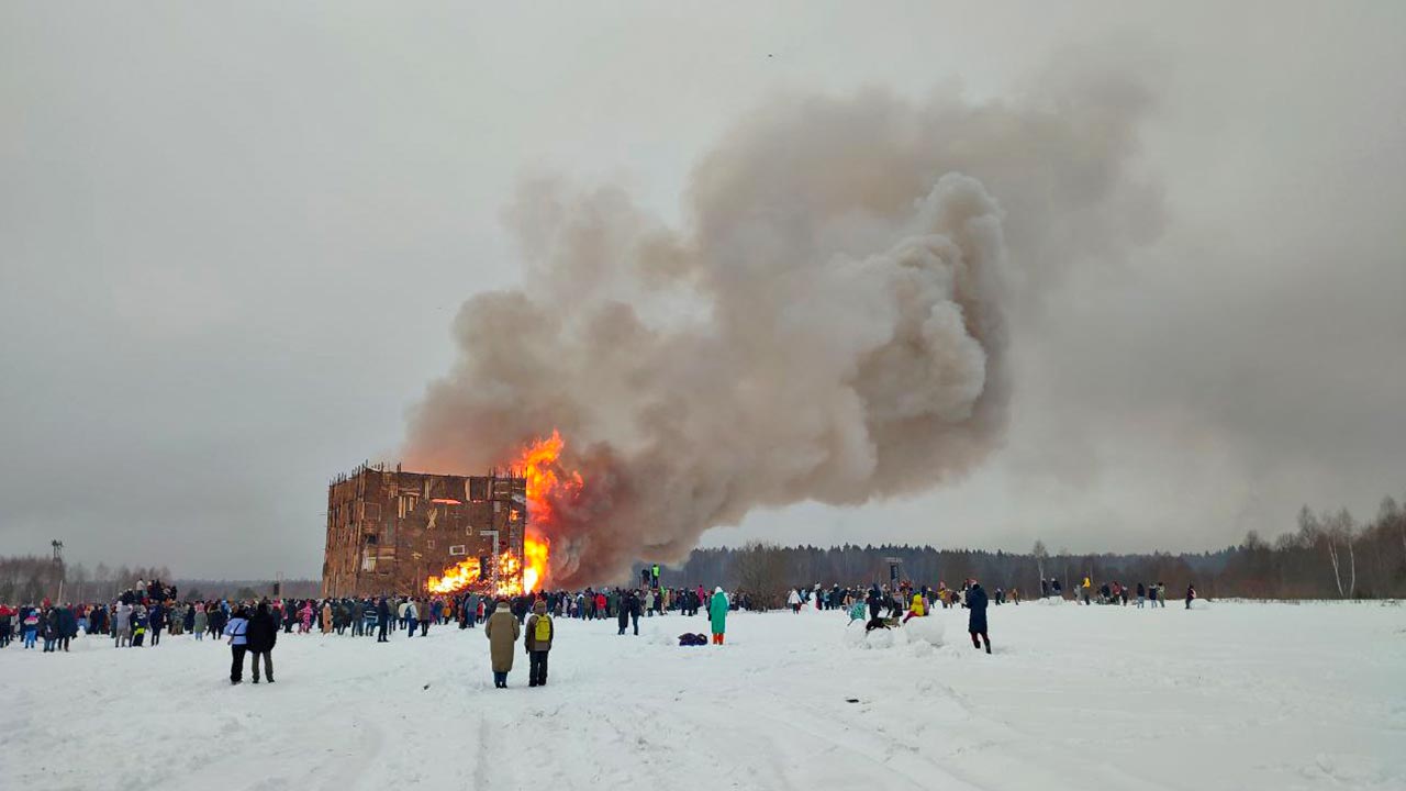 19-метровый куб сожгли в арт-парке "Никола-Ленивец" в честь Масленицы