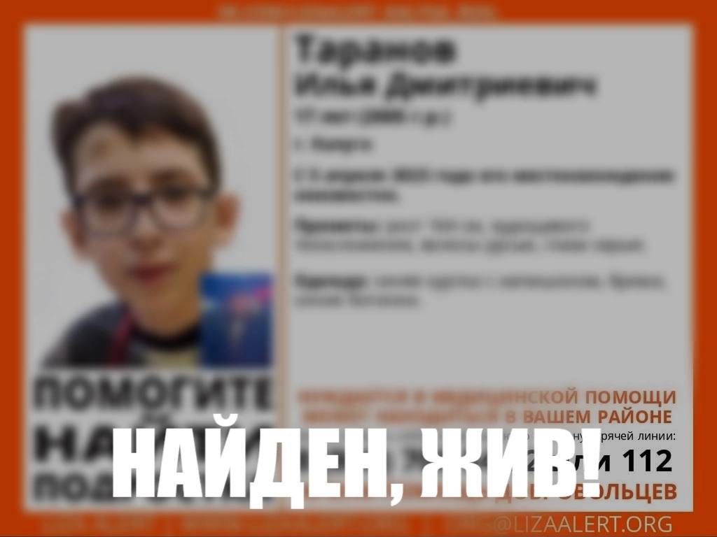 17-летний житель Калуги Илья Таранов, местонахождение которого было неизвестно с 5 апреля , найден, сообщает поисково-спасательный отряд "Лиза Алерт" в социальной сети.