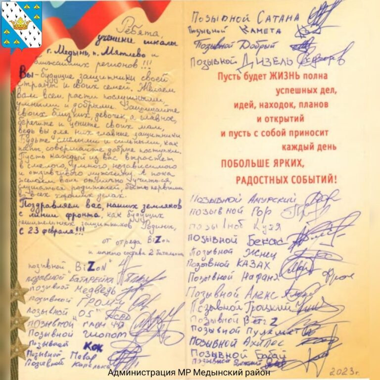 Фото: администрация Медынского районаКо Дню защитника Отечества администрация района передала школьникам открытку от бойцов. Солдаты поздравили ребят с наступающим праздником. Послание детям подписал отряд «BiZon» и личный состав второго батальона.