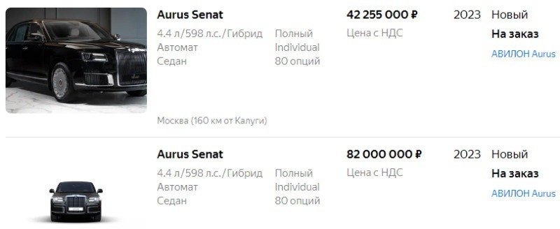 Ну, а лидером списка дозволенных авто стали машины люксового российского бренда Aurus: стартовая цена на модели Senat и Komendant с почти 600 "лошадками" начинается от 40 млн рублей, а в других комплектациях её можно найти и за 82 млн рублей.