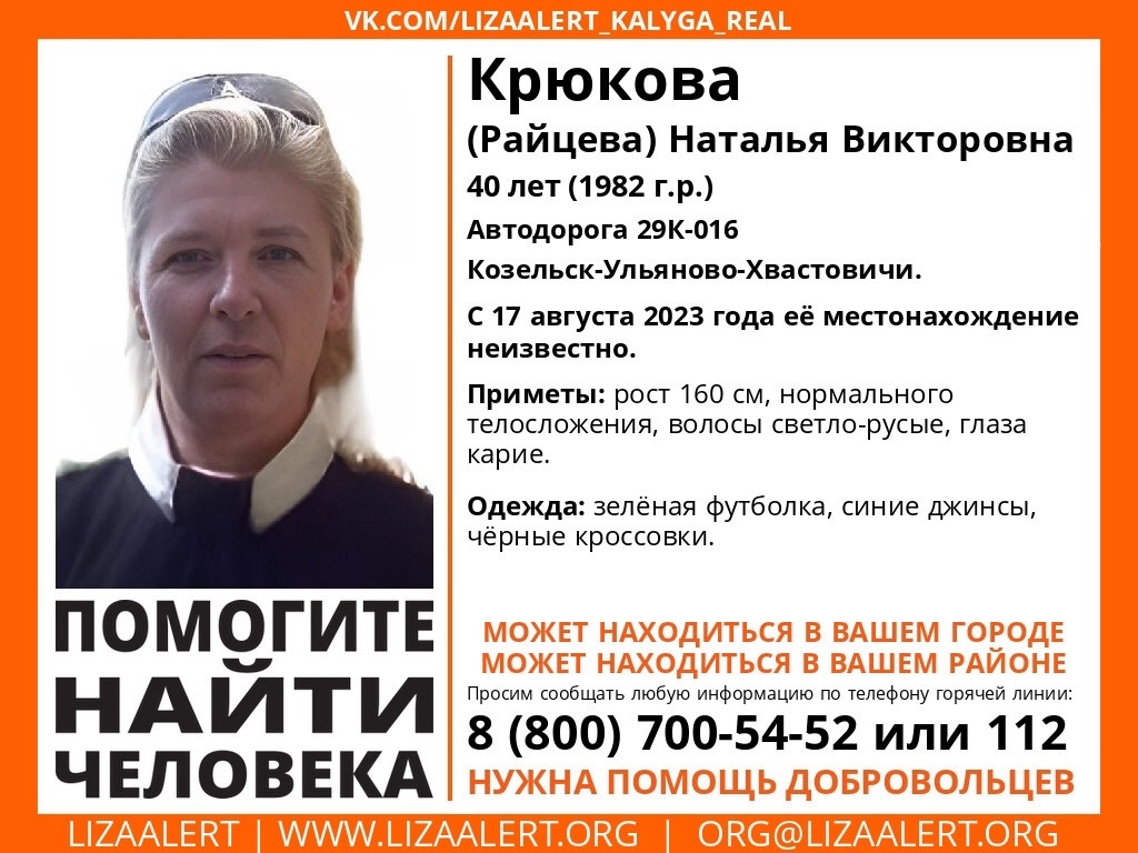 40-летняя Наталья Викторовна #Крюкова (Райцева) исчезла на автодороге 29К-016 Козельск-Ульяново-Хвастовичи, с 17 августа её судьба неизвестна.