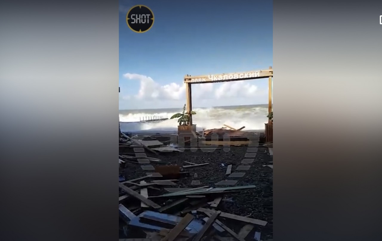 На видео запечатлены разрушенные на пляже беседки и торговые лавки. Видно, как вода до сих пор доходит до входа на пляж, к тому же волны накрывают находящуюся рядом пристань (прилагаем скриншот из видео).