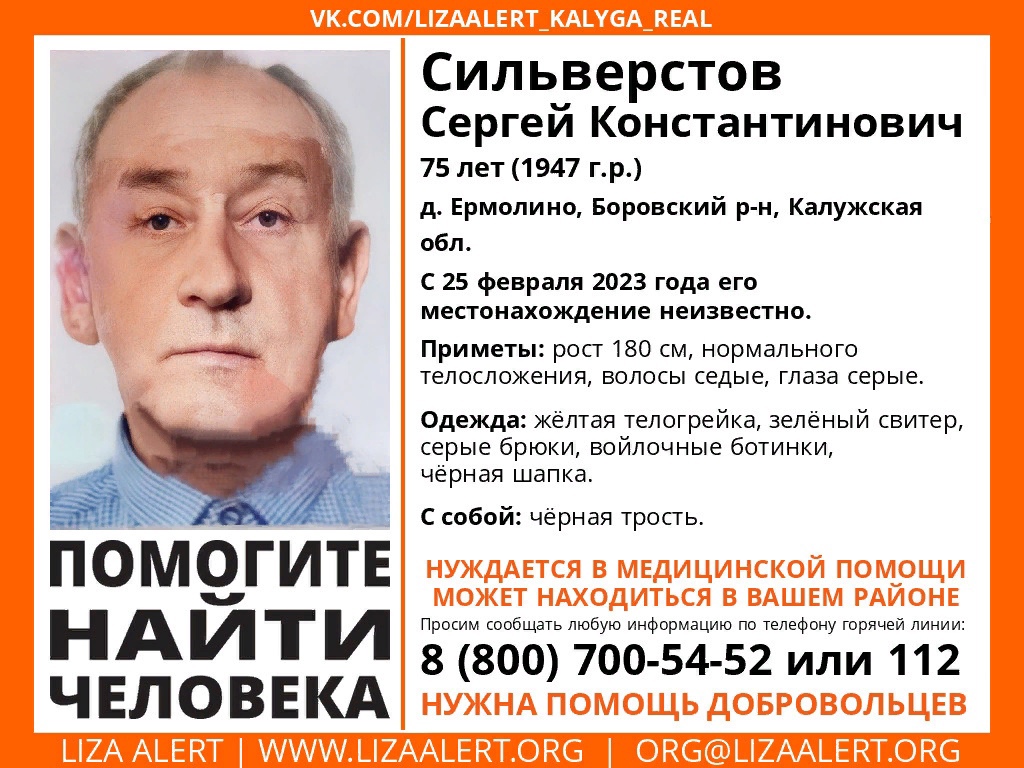 75-летний Сильверстов Сергей Константинович пропал в деревне Ермолино Боровского района, он может находиться в Калужском регионе, сообщает в поисково-спасательный отряд "Лиза Алерт".