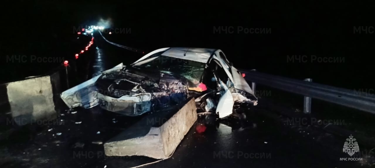 Около 5:40 утра в понедельник, 6 ноября, автомобиль «Рено Логан» врезался в бетонное ограждение на трассе Калуга – Тула в Ферзиковском районе. Фото опубликовало ГУ МЧС по Калужской области.