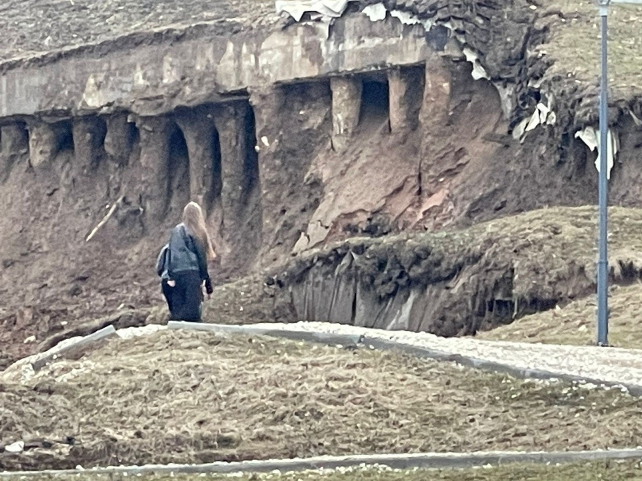 А вверху оголились строительные конструкции. Поползет ли дальше склон, пока остается только гадать. Проход к месту происшествия закрыт нескольким сигнальными лентами. Но это не останавливает подростков.