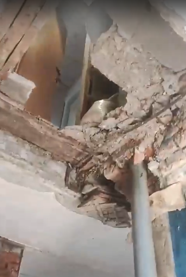скриншот из видео с места происшествияПенсионерка сейчас в больнице, у неё травма позвоночника и перелом ноги. А, по информации из того же сообщения, несмотря на небезопасные условия проживания людей, этот дом 1962 года постройки до сих пор не признан аварийным. Тем временем администрация и управляющая компания мер к устранению нарушений не принимают.
