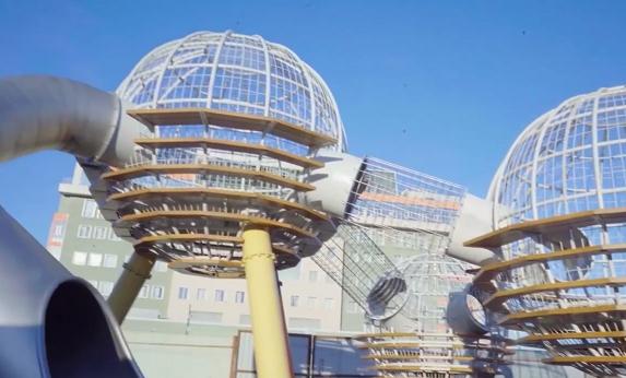 На городской детской площадке по проспекту Маркса продолжается монтаж игрового комплекса «Атомы».