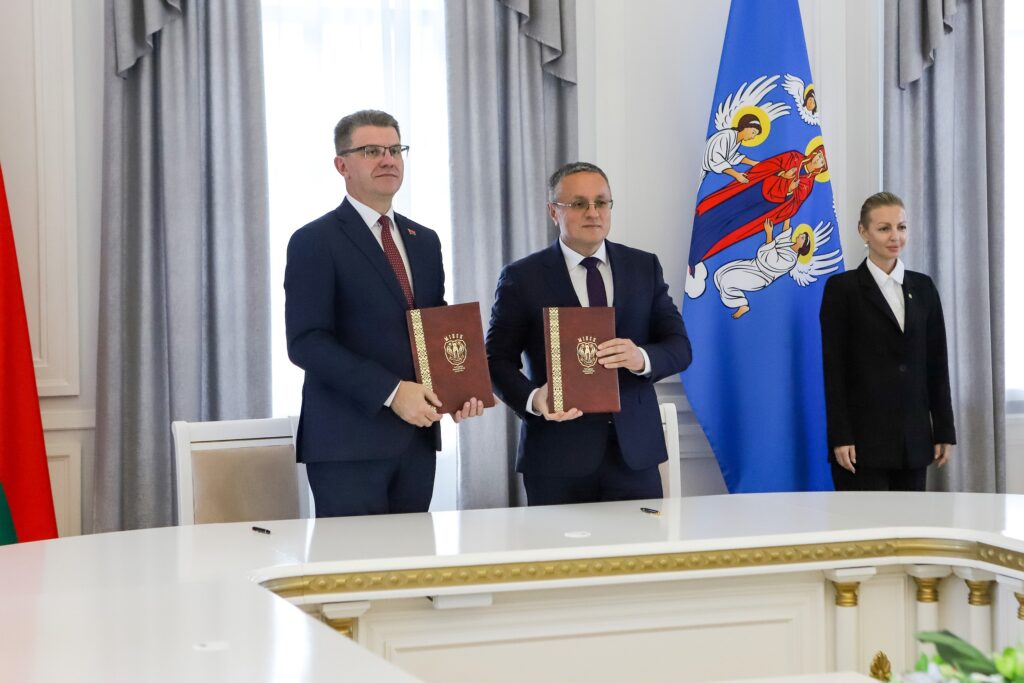 В областном центре прошла встреча калужского градоначальника и председателя Мингорисполкома Владимира Кухарева. Дмитрий Денисов поздравил город-побратим Минск с 956-летием и подписал дорожную карту по развитию торгово-экономического и гуманитарного сотрудничества.
