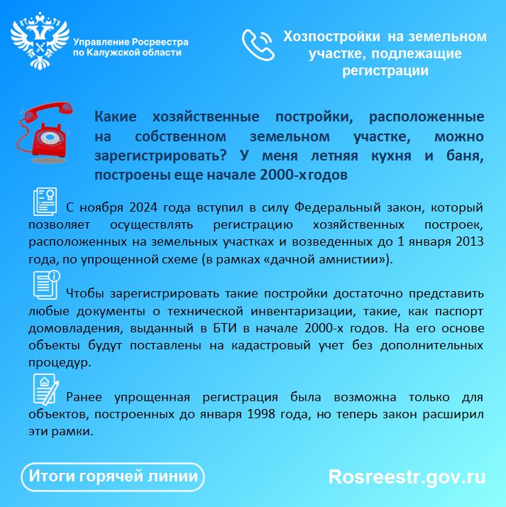 В Управлении Росреестра по Калужской области состоялась телефонная консультация в режиме «горячая линия» по вопросам регистрации хозпостроек на земельном участке.