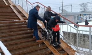 В начале года горожане рассказали о проблеме активистам Народного Фронта. А для наглядности провели эксперимент с участием представителей администрации и Горсобрания. Здоровую женщину посадили на инвалидную коляску и попытались поднять этот «груз» по существующему на мосту пандусу. Двум здоровым людям сделать это не удалось, их «пассажир» уже через несколько минут мог сломать себе шею и выпасть из коляски. И это здоровый человек, а представляете, если бы в эксперименте участвовал инвалид?