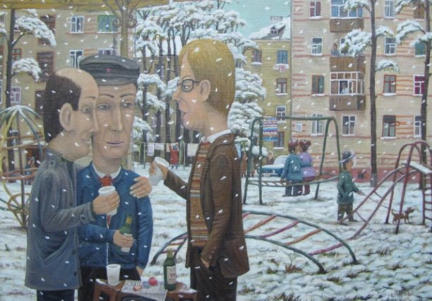 Большая часть картин написана в реалистичной манере, но особенно выделяются работы Юрия Шерова с яркими красками и жизненными историями на холсте.