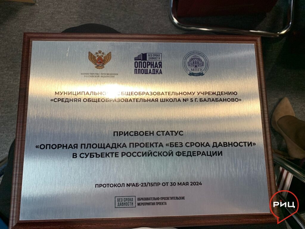 Школе №5 города Балабаново присвоен статус опорной площадки проекта «Без срока давности» в субъекте Российской Федерации. Свидетельство об этом руководство учебного заведения получило из рук заместителя министра просвещения Андрея Николаева и ректора Московского педагогического государственного университета Алексея Лубкова.