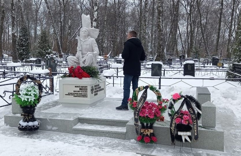 Памятник добровольцу Алексею Михееву попросили создать его родители. Год назад команда во главе с Алексеем Комовым приступила к его созданию и теперь композицию установили на могиле геройски погибшего калужанина.