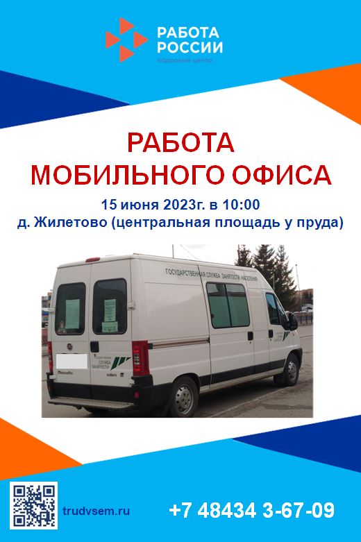 15 июня в д.Жилетово в 10.00 на центральной площади у пруда будет работать мобильный офис Центра занятости населения Дзержинского района.