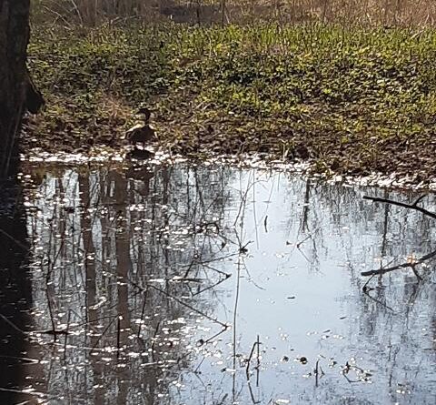 В Обнинск, после зимы, возвращаются перелётные птицы. В лесной полосе около ИМРа уточки облюбовали импровизированное озеро.