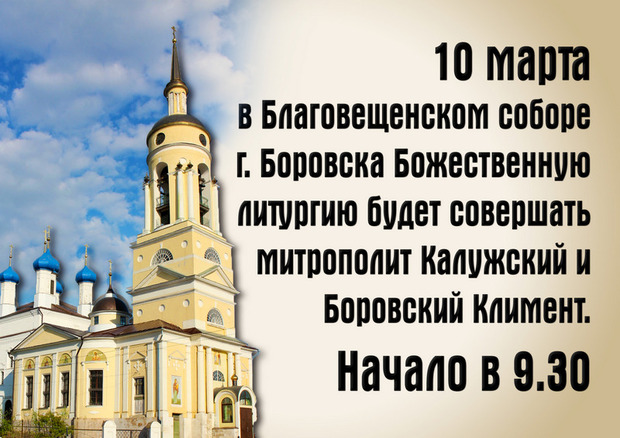 10 марта в Благовещенском соборе города Боровска Божественную литургию будет совершать митрополитк Калужский и Боровский Климент. Встреча архиерея в 9.30.