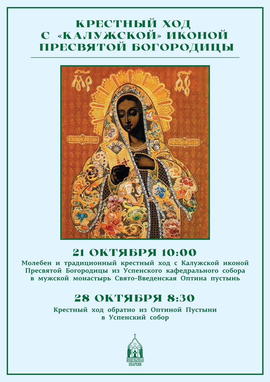21 октября состоялся традиционный крестный ход с Калужской иконой Пресвятой Богородицы из Успенского кафедрального собора города Козельска в ставропигиальный мужской монастырь Оптину пустынь. Начался крестный ход в Успенском соборе. Молебен перед началом крестного хода возглавил насельник Оптиной Пустыни игумен Макарий (Краевский) в сослужении духовенства Козельского благочиния и братии монастыря. Затем, торжественным шествием, священники перенесли образ Пресвятой Богородицы в Казанский храм Оптиной Пустыни, где икона будет прибывать в грядущие праздничные дни. Обратно, в Успенский собор, икону принесут таким-же торжественным шествием после празднования дня памяти иконы Пресвятой Богородицы «Спорительница хлебов».