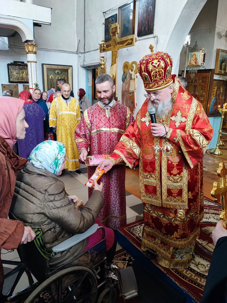 Архипастырь поздравил настоятеля собора протоиерея Алексия с пасхальными торжествами и преподнес ему памятный подарок. Отец Алексий также поздравил владыку и также преподнес ему от прихода пасхальные дары.