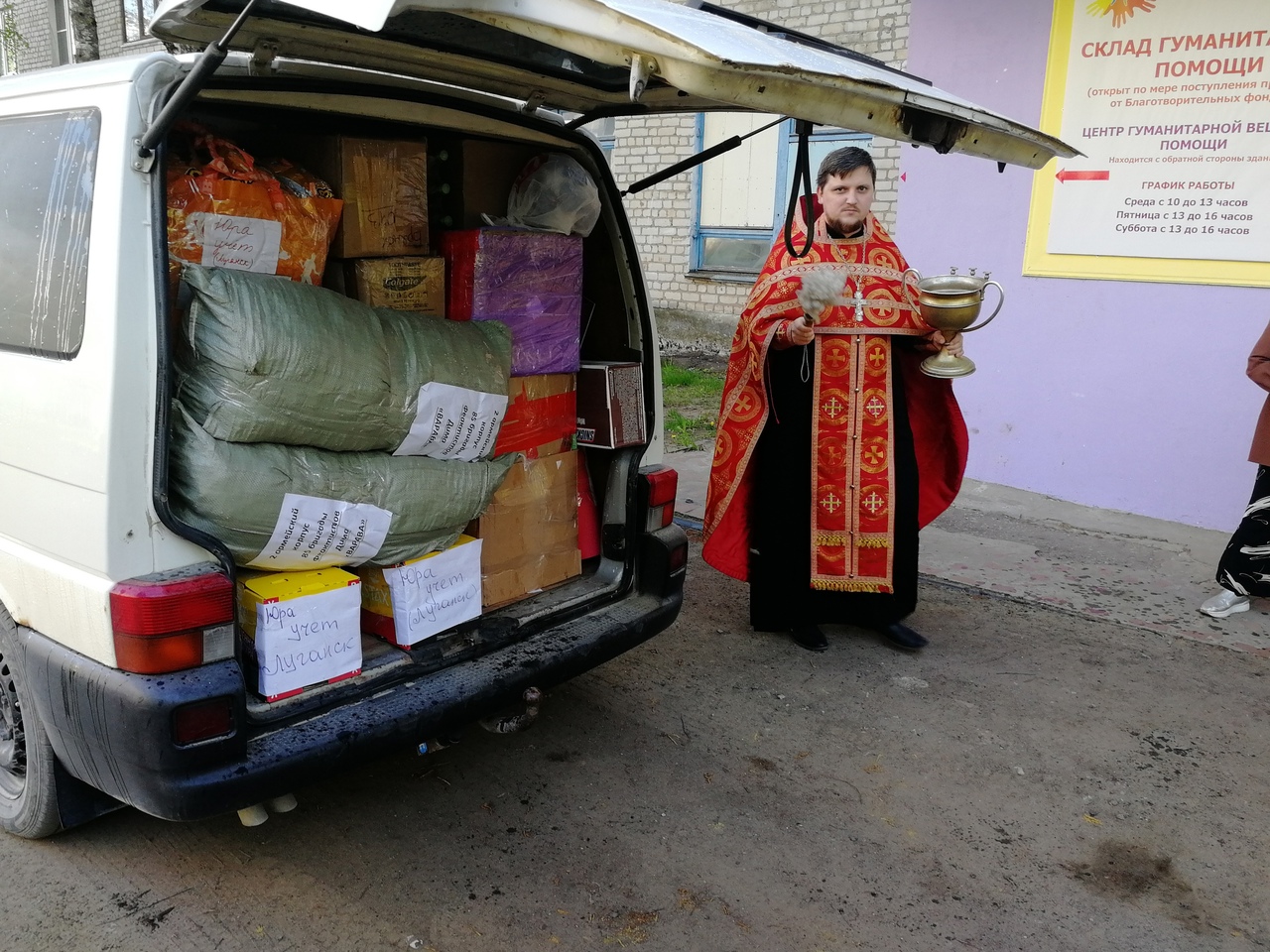 Перед отправкой был совершен молебен. Клирик храма в честь святого праведного Лазаря иерей Иоанн Майоров напутствовал водителя и волонтеров, сопровождающих груз, отслужив молебен и окропив всех святой водой. Отец Иоанн пожелал всем волонтерам Божией помощи в трудах во благо людей и благословил путешествующих.