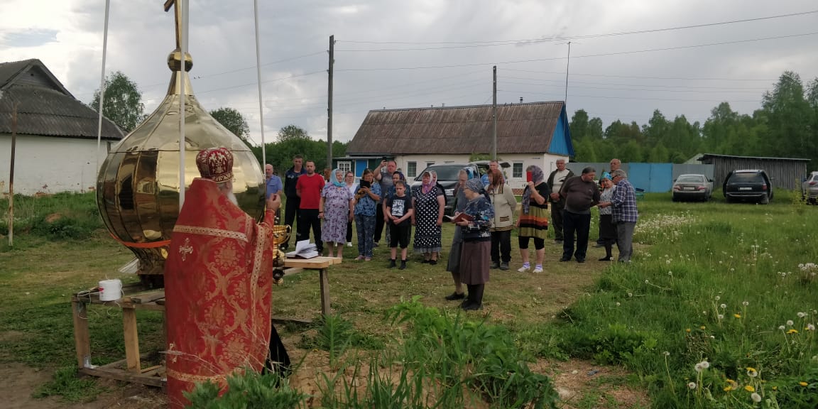 По благословлению правящего архиерея епископа Козельского и Людиновского Никиты отец Алексий совершил «Чин молитвенный на поставление Креста на верх крова новосозданныя церкви». На доброе и важное событие для деревни собрались многие её жители. Здесь же были и руководители строительства Валерий Петраков и Игорь Якушев со своими помощниками, тоже жителями деревни: Александром Ивановым, Алексеем Ивановым, Николаем Веркиным, Сергеем Таракановым, Юрием Егоровым, Данилой Пуликовым, Вячеславом Петраковым и крановщиком Василием Кричфалуший.