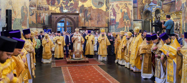 В праздник Крещения Руси Святейший Патриарх Кирилл совершил Литургию в Успенском соборе Московского Кремля