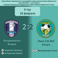 16 февраля в рамках Первенства СФФ «Центр» (Всероссийские соревнования «Первая лига», чемпионаты ЦФО и ЮФО) по мини-футболу (футзалу) среди женских любительских команд (группа «Б») в матче шестого тура в нашем областном центре встретились землячки – ЖФК «Ника – СШ №5» и МЖФК «Калужаночка».