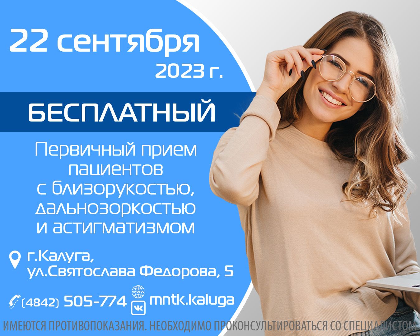 Бесплатный первичный прием пациентов с близорукостью, дальнозоркостью и астигматизмом ведущего рефракционного лазерного хирурга Акция состоится 22 сентября г. Калуга, ул.