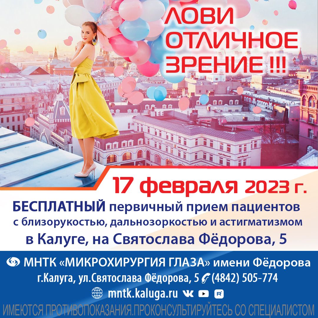 Бесплатный первичный прием пациентов с близорукостью, дальнозоркостью и астигматизмом ведущего рефракционного лазерного хирурга Акция состоится 17 февраля 2023 года г. Калуга, ул.