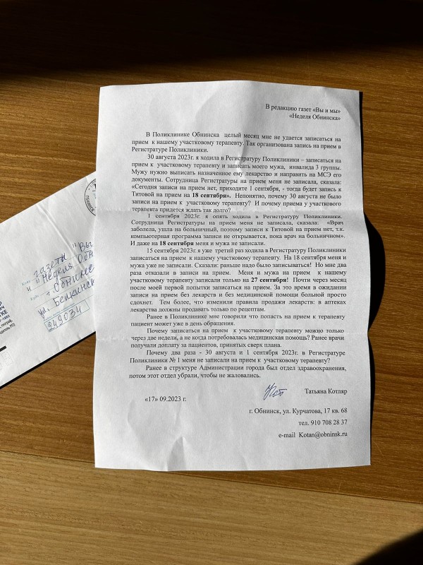 "В Поликлинике Обнинска целый месяц мне не удается записаться на прием к нашему участковому терапевту. 30 августа 2023 г. я ходила в Регистратуру Поликлиники — записаться на прием к участковому терапевту и записать моего мужа, инвалида 3 группы.