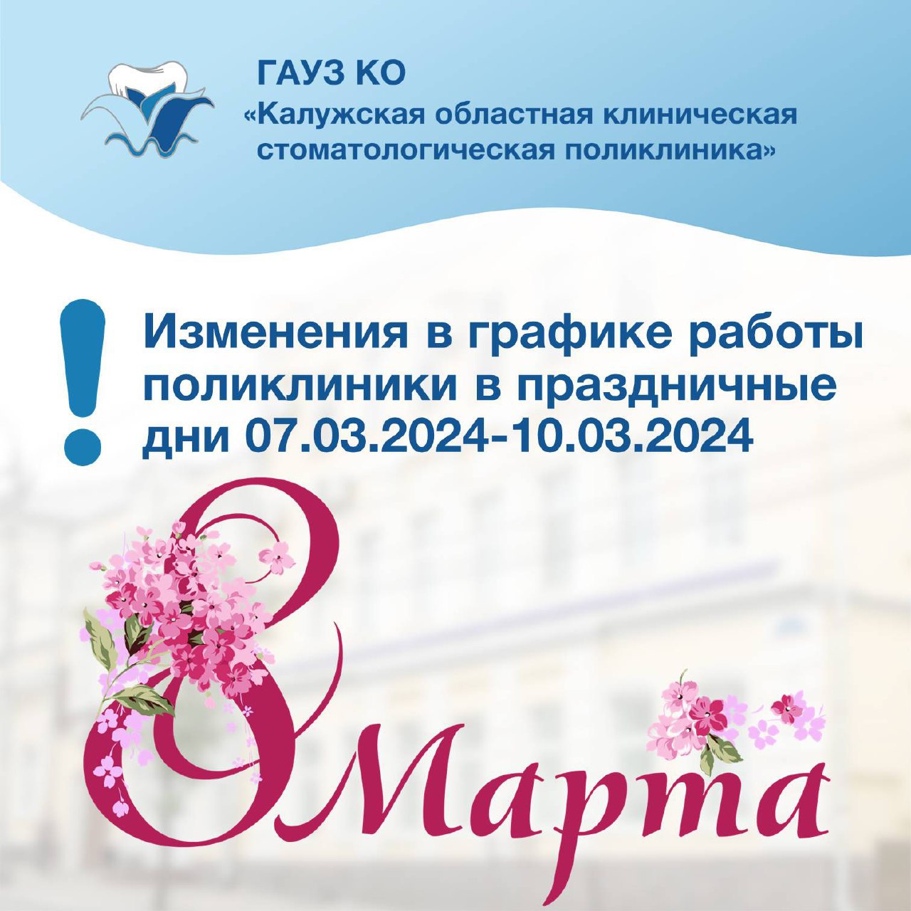Уважаемые пациенты! Обращаем ваше внимание на режим работы поликлиники в праздничные и выходные дни 7-10 марта.