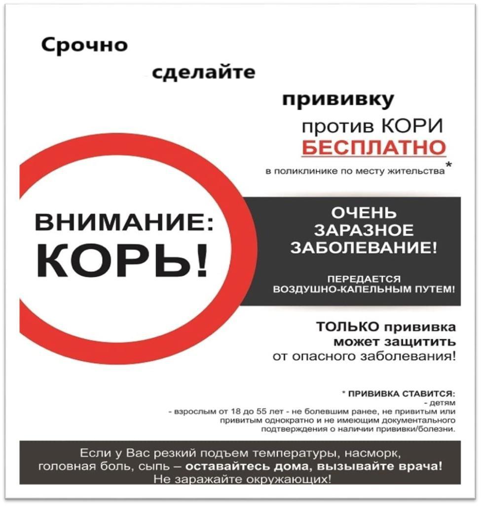 Корь является крайне заразной и тяжелой болезнью вирусного происхождения. Корь остается одной из основных причин смерти среди детей раннего возраста. Специфического лечения против кори не существует. Единственным надежным методом предупреждения кори является иммунизация! В связи с неблагополучной эпидситуацией по кори в зарубежных странах, странах ближнего зарубежья и ряде регионов Российской Федерации в целях предупреждения распространения коревой инфекции на территории Российской Федерации Главным государственным санитарным врачом Российской Федерации А.Ю. Поповой утверждено постановление от 08.02.2023г. № 1 «О проведении подчищающей иммунизации против кори на территории Российской Федерации» (зарегистрировано в Минюсте 07.03.2023г.). В соответствии с данным Постановлением в срок с 03.04.2023 по 31.12.2023 в каждом субъекте Российской Федерации должна быть проведена подчищающая иммунизация против кори населения (не привитые против кори, не имеющие сведений о прививках против кори и не болевшие корью ранее). Сделать прививки против кори можно в медицинской организации по месту жительства. Следует напомнить, что плановая вакцинация проводится в соответствии с национальным календарем профилактических прививок (Приказ Минздрава РФ от 6 декабря 2021 г. N 1122н «Об утверждении национального календаря профилактических прививок, календаря профилактических прививок по эпидемическим показаниям и порядка проведения профилактических прививок»).