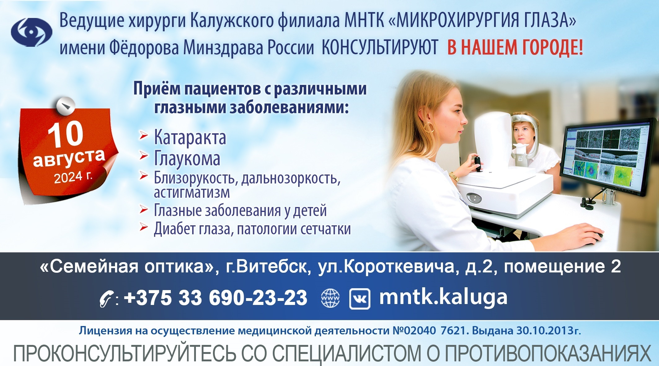 ВОСПОЛЬЗУЙТЕСЬ УНИКАЛЬНОЙ ВОЗМОЖНОСТЬЮ! Впервые ведущие хирурги Калужского филиала федеральной клиники МНТК«МИКРОХИРУРГИЯ ГЛАЗА» имени Фёдорова МЗ РФ проводят консультативно-диагностические приемы в г. Витебск,