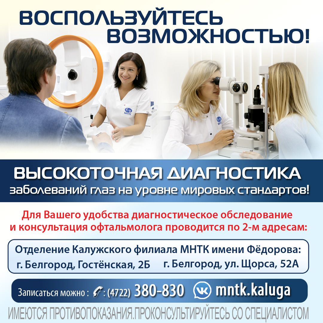 Внимание! Для удобства пациентов диагностическое обследование и консультация врача-офтальмолога проводится в отделении Калужского филиала Федерального учреждения МНТК имени Фёдорова по адресам: