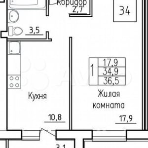 Общая площадь, - 34.7 м2 . Индивидуальное отопление.