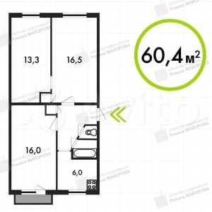 Общая площадь - 60,4 кв.м + балкон (2,7 кв.м). Здесь просторная входная зона (4,9 кв.м), раздельный санузел, большие комнаты (самая маленькая - 13,3 кв.м).